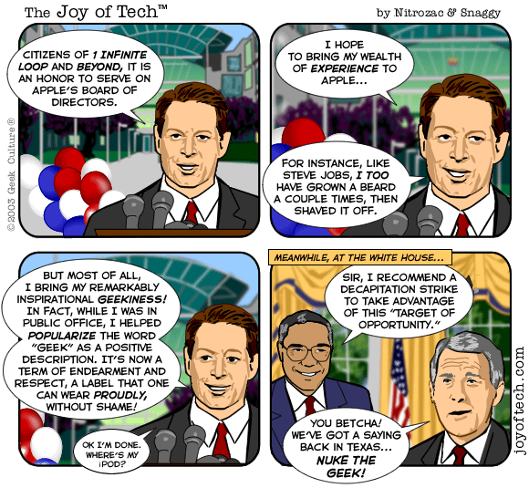 If you're using a Mac and a newer version of Explorer, here's a neat trick courtesy of MacMerc. Drag the above little image to the top tool bar of your browser, it should "stick" afterwards. Now you have a graphical link to the Joy of Tech, one that will update everytime a new comic is uploaded. (You may have to refresh the image manually if it's in your cache.) If you need to delete or move it it, just control button/click and hold, then select delete, or just Command/drag it to the trash.