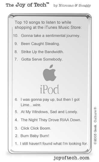 If you're using a Mac and a newer version of Explorer, here's a neat trick courtesy of MacMerc. Drag the above little image to the top tool bar of your browser, it should "stick" afterwards. Now you have a graphical link to the Joy of Tech, one that will update everytime a new comic is uploaded. (You may have to refresh the image manually if it's in your cache.) If you need to delete or move it it, just control button/click and hold, then select delete, or just Command/drag it to the trash.