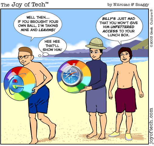 If you're using a Mac and a newer version of Explorer, here's a neat trick courtesy of MacMerc. Drag the above little image to the top tool bar of your browser, it should "stick" afterwards. Now you have a graphical link to the Joy of Tech, one that will update everytime a new comic is uploaded. (You may have to refresh the image manually if it's in your cache.) If you need to delete or move it it, just control button/click and hold, then select delete, or just Command/drag it to the trash.