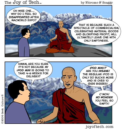 If you're using a Mac and a newer version of Explorer, here's a neat trick courtesy of MacMerc. Drag the above little image to the top tool bar of your browser, it should "stick" afterwards. Now you have a graphical link to the Joy of Tech, one that will update everytime a new comic is uploaded. (You may have to refresh the image manually if it's in your cache.) If you need to delete or move it it, just control button/click and hold, then select delete, or just Command/drag it to the trash.