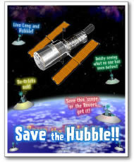 ![]() Save the Hubble!It doesn't take a powerful lens to see that the Hubble Space Telescope is something worth saving. With certain parties in NASA threatening to shut down the Hubble before it's time, we need to get the word out to Save the Hubble! Show how you feel with one of our great tees, caps, posters, stickers mugs, and more. Available in two awesome designs: our original comic, and also a simplier design without the alien protesters. Both are gorgeous illustrations by Nitrozac. Let's hope if enough of us spread the word, the Hubble can keep on looking into the past, for a long time in the future! |
