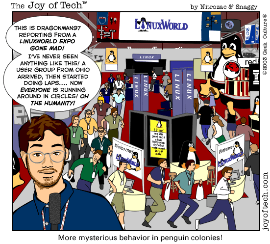 If you're using a Mac and a newer version of Explorer, here's a neat trick courtesy of MacMerc. Drag the above little image to the top tool bar of your browser, it should "stick" afterwards. Now you have a graphical link to the Joy of Tech, one that will update everytime a new comic is uploaded. (You may have to refresh the image manually if it's in your cache.) If you need to delete or move it it, just control button/click and hold, then select delete, or just Command/drag it to the trash.