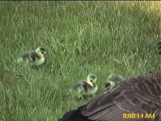 | The Canada Geese that were nesting in the tree had their family hatch! In a very interesting event, a number of geese came over to check out the new chicks. At first we thought it was an attack, there was quite a commotion and lots of honking. It seemed like at least two of the geese were protecting the mother, standing as guards right up there on the nest, while the dad was down below keeping others away. |